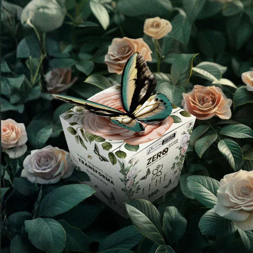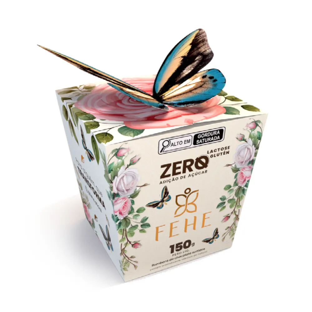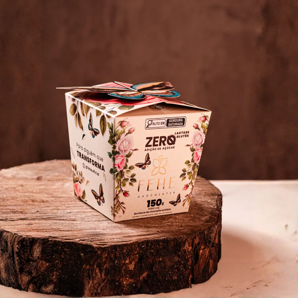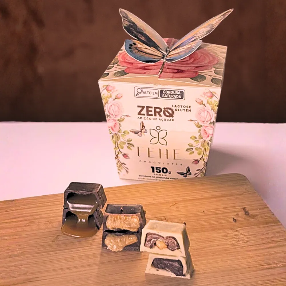 A apresentação também é um destaque: a embalagem exclusiva em formato de presente traz o símbolo da borboleta, representando transformação, leveza e bem-estar, valores que fazem parte da essência da Fehe. É um presente que impressiona visualmente e encanta ainda mais pelo sabor.