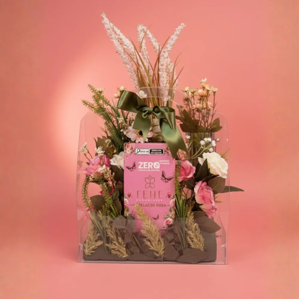 O Presente Doce Jardim Fehe nasceu para quem acredita que presentear é uma forma de emocionar. Dentro de uma charmosa sacola de acrílico, um arranjo floral delicado envolve uma joia rara: a barra de chocolate de pétalas de rosa Fehe 50g. O resultado é um gesto que une elegância, sabor e propósito, ideal para quem deseja surpreender com beleza e consciência. Cada detalhe do Doce Jardim encanta à primeira vista. O aroma das flores, o brilho da embalagem e o toque artesanal criam uma experiência sensorial única. O chocolate é preparado com ingredientes naturais, zero açúcar, zero lactose e zero glúten, além de não ter de origem animal, garantindo prazer e leveza em cada mordida. Mais do que um presente, o Presente Doce Jardim representa o ato de florescer de dentro para fora. É ideal para celebrar momentos especiais, como aniversários, agradecimentos e datas comemorativas, ou simplesmente para demonstrar carinho de forma inesquecível. Experimente também a nossa Barra de Chocolate 70% Cacau ou a Barra de Chocolate ao Leite com Avelãs.
